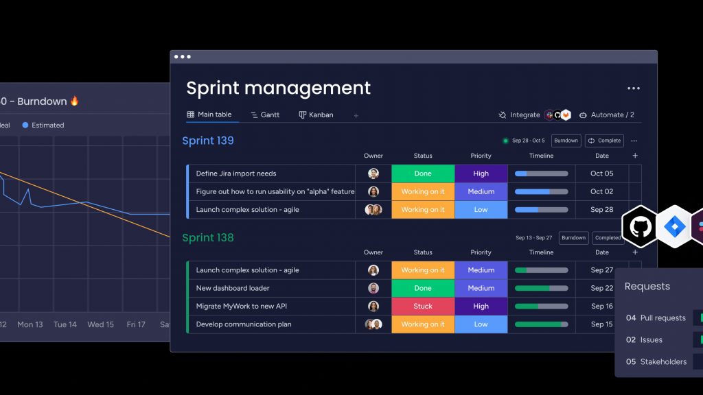 - Multiple views (boards, timelines, Gantt-style views) for the same work