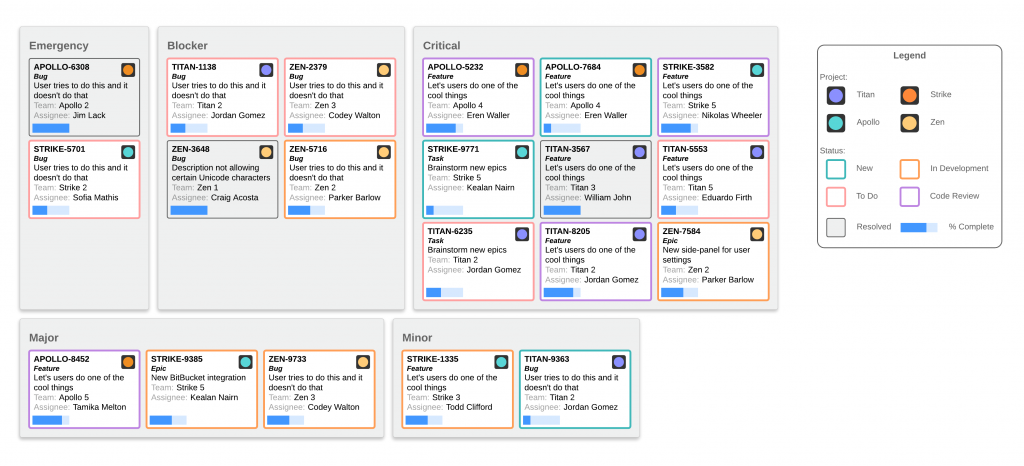 - Offers neat visual customization options like percentage-complete bars, and colored “traffic light” indicators