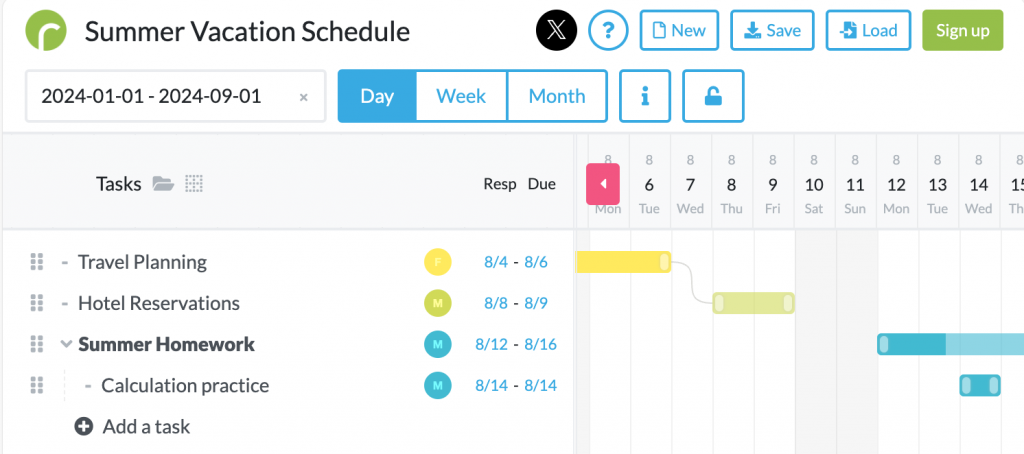 - Clearly displays task start and end dates on the timeline, with color-coded task bars